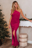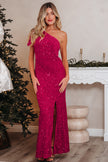 - Thigh high split adds allure and movement to this bodycon sequin gown.